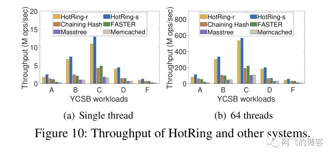 最后,我们通过YCSB对HotRing方案进行了压力测试,并对比了行业有名的Memcached等。压测结果如下图所示,我们可以看到HotRing方案的吞吐量远超其他方案: