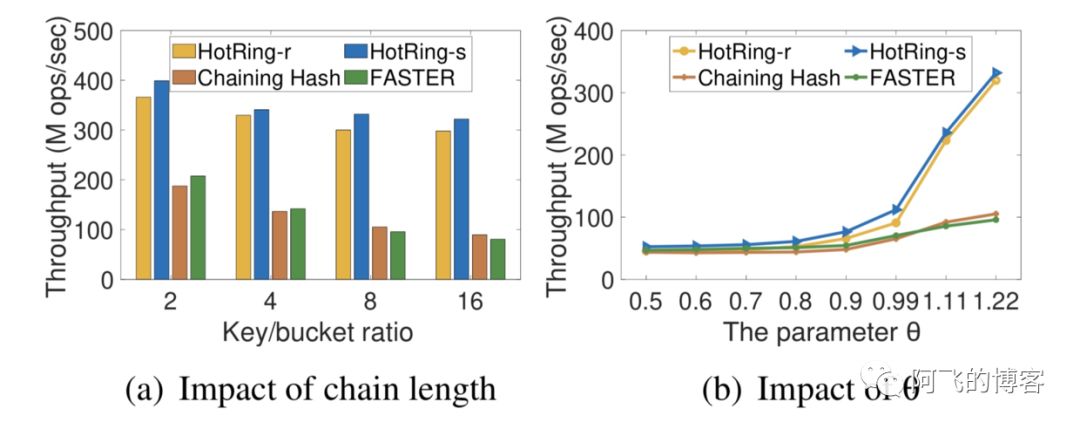 此外,压测了链表长度对性能的影响,如下图所示,我们可以发现当链表长度从2一直递增到16的过程中。HotRing方案的性能几乎是恒定的。而一致性Hash和FASTER方案的性能很明显梯度递减了: