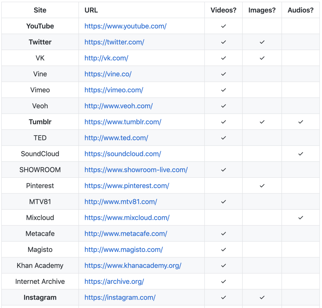 上面只是演示了用一行代码可下载小破站的视频,其实除了小破站,还可以用这一行代码下载国内外很多主流网站的视频、图片和音乐。
