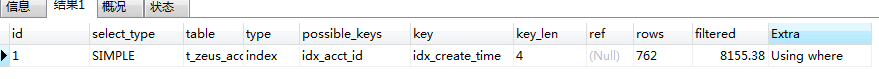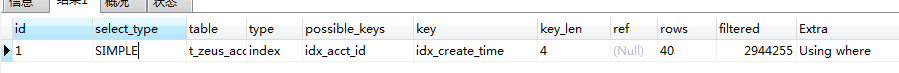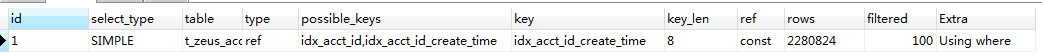 可以看出改情况用idx_acct_id索引是比较快的,那么是不是这样就可以了呢,排序未用上索引,始终是有隐患的。select * from acct_trans_log force index(idx_acct_id)WHERE acct_id = 3095 order by create_time desc limit 0,10