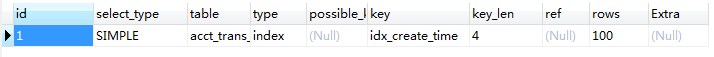 索引还是用idx_acct_id_create_time,时间居然慢下来了。 看执行计划,排序用到了filesort,也就是说,排序未用到索引。那么我们还是来看看,索引排序的原理,我们先来看一个sql:select * from acct_trans_logORDER BY create_time limit 0,100