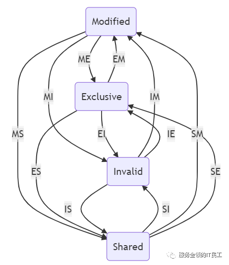 MESI名称来自4个状态的首字母的缩写,分别是Modified、Exclusive、Share、Invalid,每个CPU读取共享数据之前先要识别数据的对象状态,然后根据这几个状态分别执行不同的策略,下面我们分别了解下每个状态所代表的含义。