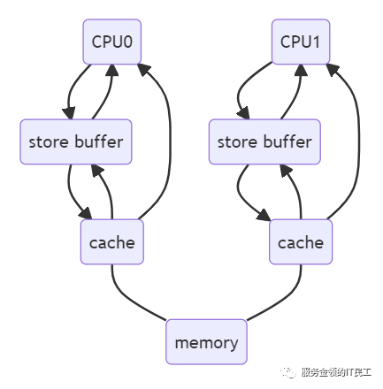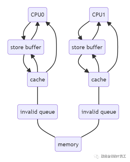 MESI协议逻辑很严谨,但是简单直观的实现有两个特别低效的行为。首先,当准备写入数据到无效的cache line中时,需要先发出read invalidate消息通知其他CPU,然后等待所有CPU的invalidate acknowledge消息回来后才能继续执行,这是一种同步行为;其次,把cache line置为Invalid状态也很耗时。对应的,硬件工程师给CPU设计了store buffer和invalid queue来解决。