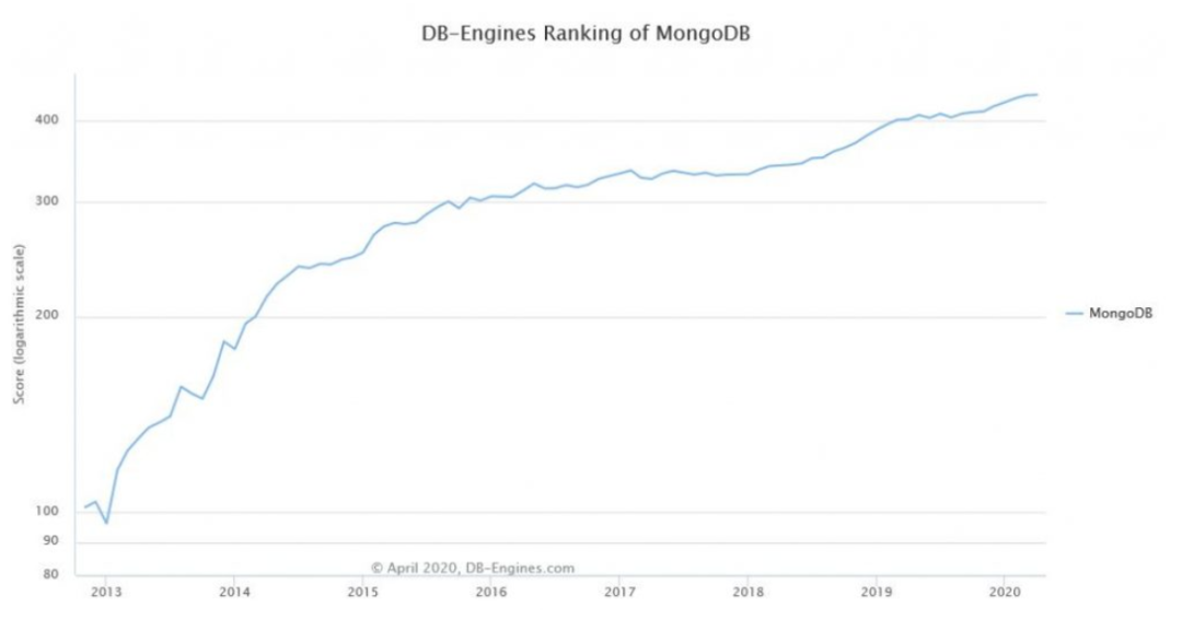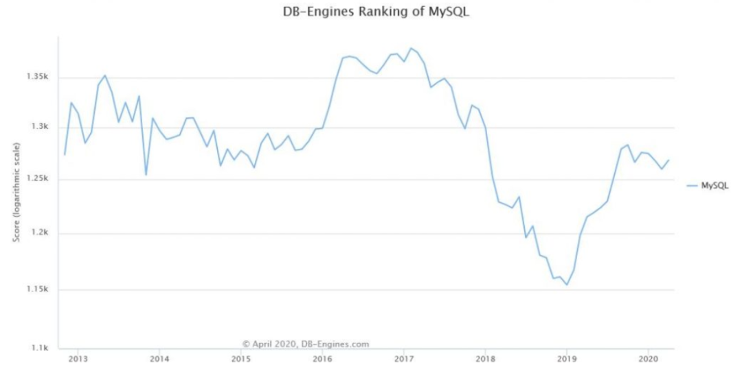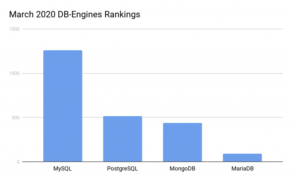 根据DB-engines的数据,以下是根据总体受欢迎程度的排名。截至2020年3月,MySQL的流行度仍是PostgreSQL和MongoDB的2倍。