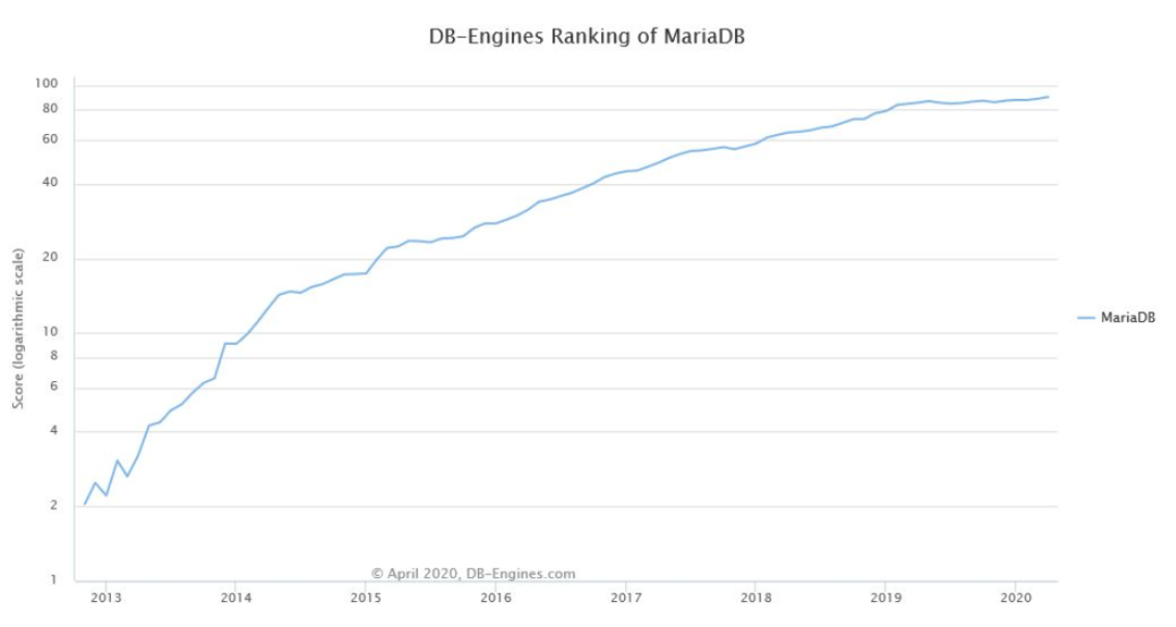 DB-Engines显示MariaDB在过去几年中取得了显著增长,但它的普及率不到MySQL的1/10。MariaDB在很多Linux发行版中是默认的,这有助于其在社区中的发展,但目前尚未取得重大的商业成功。