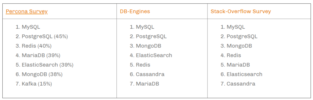 Percona调查问卷、DB-Engines排名、Stack-Overflow调查问卷。