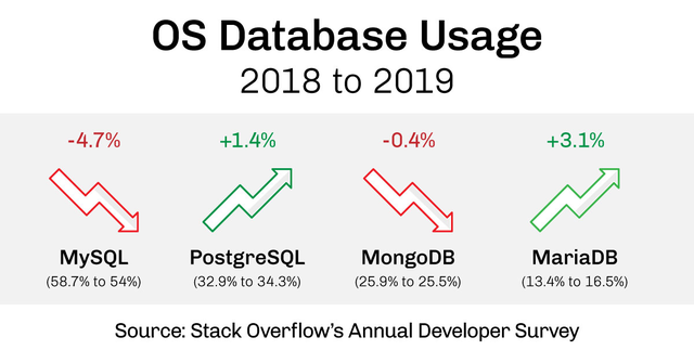 Stack-Overflow 每年都会进行大型开发人员调查(2019年有90,000名受访者)。以下是开源数据库 2018-2019年之间的使用率差异。