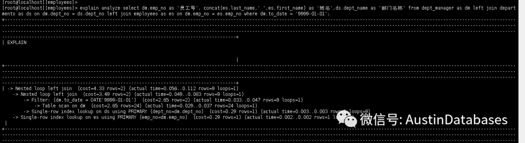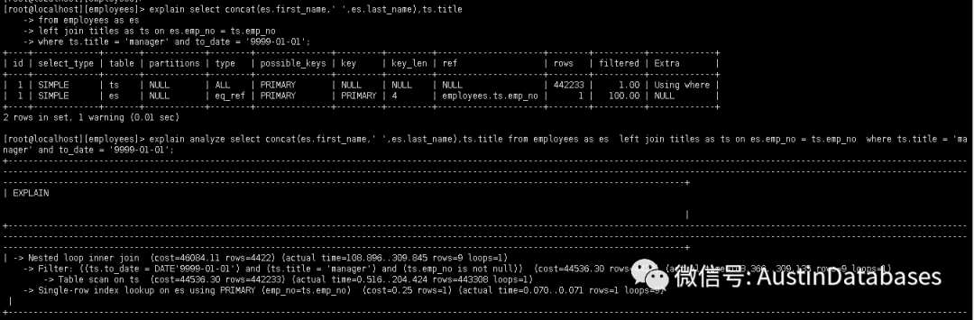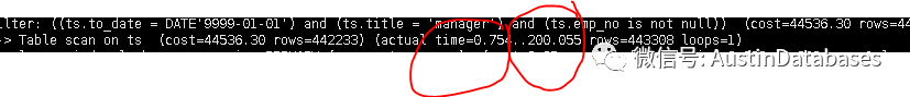 从上面给出的计划来看,1 先对 TS 进行 TABLE SCAN 行数 442233 行,实际上是 443308 行, 通过 INDEX LOOKUP 的方式,每次扫描使用0.07毫秒,并且同时会过滤 to_date, title emp_no 等条件 采用 Nested loop inner join 的方式。