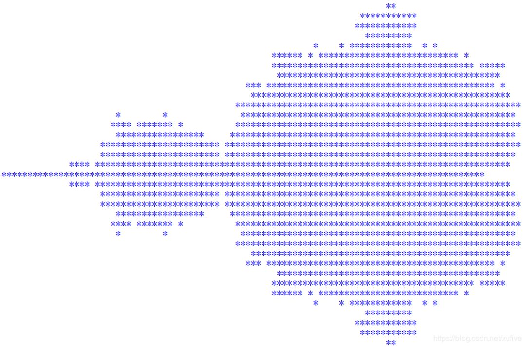 print('\n'.join([''.join(['*' if abs((lambda a:lambda z,c,n:a(a,z,c,n))(lambda s,z,c,n:z if n==0 else s(s,z*z+c,c,n-1))(0,0.02*x+0.05j*y,40))<2 else ' ' for x in range(-80,20)]) for y in range(-20,20)]))