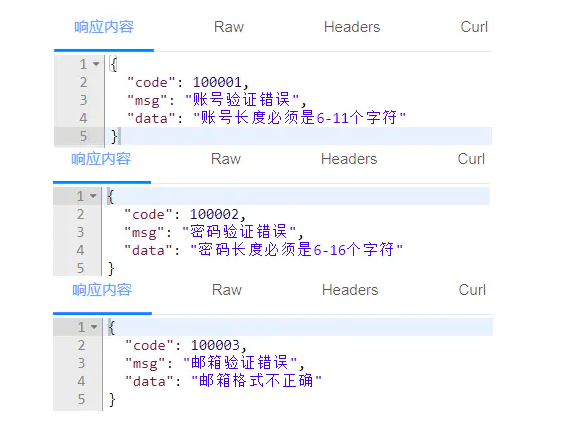 @PostMapping("/addUser")public ResultVO<String> addUser(@RequestBody @Valid User user, BindingResult bindingResult) { for (ObjectError error : bindingResult.getAllErrors()) { 拿到校验错误的参数字段 String field = bindingResult.getFieldError().getField(); 判断是哪个字段发生了错误,然后返回数据响应体 switch (field) { case "account": return new ResultVO<>(100001, "账号验证错误", error.getDefaultMessage()); case "password": return new ResultVO<>(100002, "密码验证错误", error.getDefaultMessage()); case "email": return new ResultVO<>(100003, "邮箱验证错误", error.getDefaultMessage()); } } 没有错误则返回则直接返回正确的信息 return new ResultVO<>(userService.addUser(user));}
