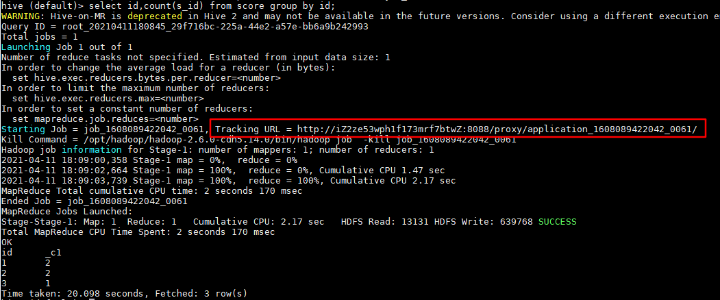 创建视图的时候是不会触发 MapReduce 的 Job,因为只存在元数据的改变。