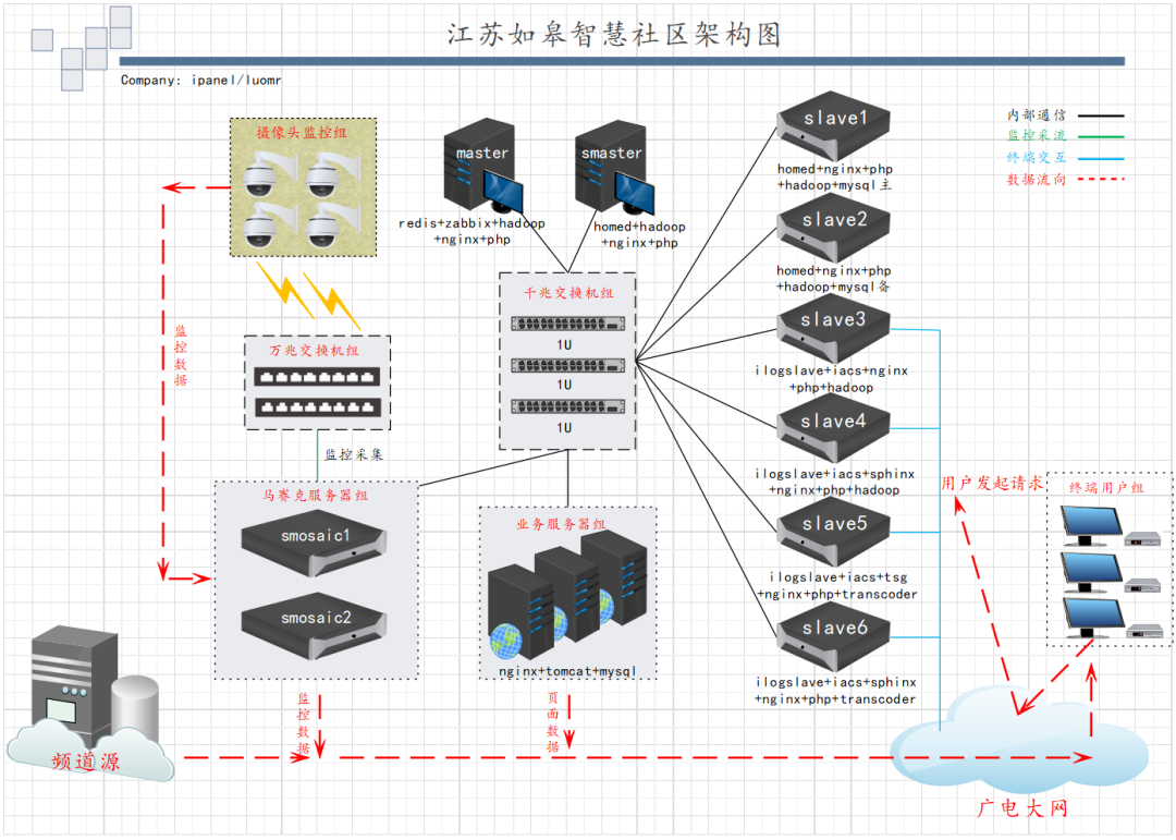 在江苏如皋,自己作为运维,在现场工程实施同事的配合下,真真正正的独立实现了一次整个项目的实施。内容包括:集群部署规划 > 集群部署方案 > 服务器装系统 > 服务器上架 > 机房网络走线 > 集群环境实现 > 功能服务部署(包括视频存储、录流、推流、点播、转码、负载均衡等一系列功能)等,就快到大功告成之时,却因为商务谈判关系,此项目被另一家竞争队友给接盘了,自己亲手盖的房子就快要封顶大吉了,却被别人接手了,这把我给气的吖!但是让我引以为豪的是在没有任何人要求下,我自己根据对整体项目的了解,画了一张基础架构图,对于刚毕业不久的我来说,也是一个小惊喜吧!如下: