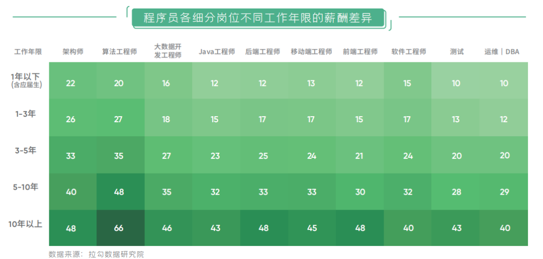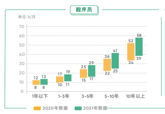 与 2020 年平均薪酬相比,2021 年程序员岗位则是 1-3 年、3-5 年 及 5-10 年平均薪酬涨幅相对较明显,而且随着技术经验的积累,薪资涨幅更大。虽说我们看到前段时间大厂纷纷裁员事件和程序员失业转行的“噩耗”,但程序员类岗位依旧是在各阶段都急需人才。