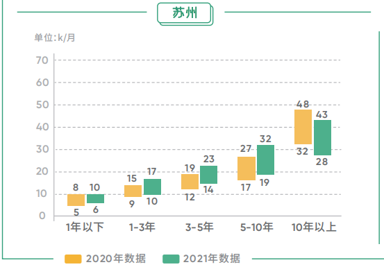 这里有个很明显的点,苏州 10 年以上的程序员岗位薪酬下降了 10% 左右。其原因诸多,这里不展开说明。