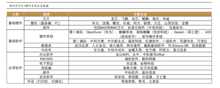 具体看,整个信创产业主要包括基础硬件(芯片、服务器、存储)到基础软件(操作系统、数据库、中间件),再到应用软件(办公软件、OA、ERP)这三部分。