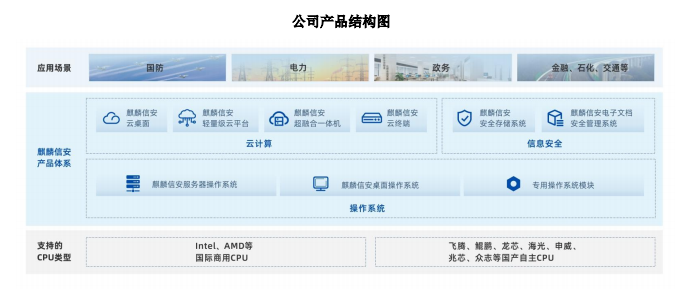 目前公司形成了“操作系统-云计算-信息安全”三位一体的产品体系,即以操作系统技术为根技术,操作系统产品为基石,信息安全产品和云计算产品为延伸的紧相关产品结构。
