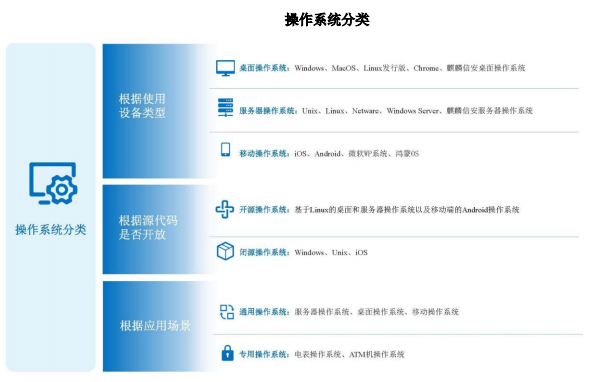 操作系统有很多种划分标准,按照操作系统面向的终端设备类型,可以分成桌面操作系统、服务器操作系统、移动操作系统。
