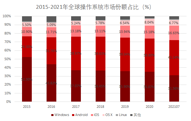 也就是说,截止到2021年7月,全球操作系统的前三全部是美国公司,且三者市场份额加起来接近90%。