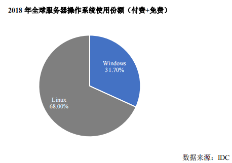 根据 Gartner 在2018 年的统计数据,全球服务器操作系统市场收入份额(付费+免费)中,Linux的占比为 68.00%。