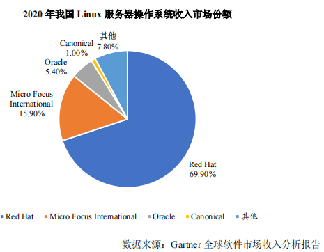 在Linux服务器系统中,我国的优势极大,根据Gartner在2020年发布的全球软件市场收入分析报告,中国Linux服务器操作系统Red Hat(RHEL)的市场收入份额为69.9%。