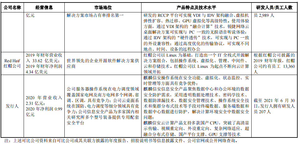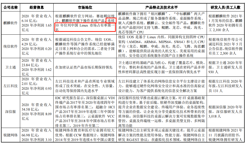 根据麒麟信安招股书披露,其在国内的竞争对手主要包括麒麟软件、统信软件、卫士通、左江科技、深信服、锐捷网络、红帽公司。