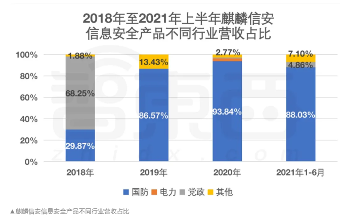 具体看,其应用领域也符合国内信创产业的现状,主要集中在国防、电力、党政三大块,尤其是占比最高的信息安全产品,来自国防的收入占比接近90%。