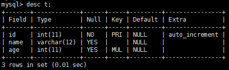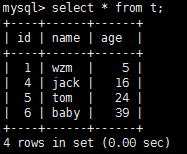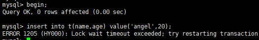 mysql> begin;Query OK, 0 rows affected (0.00 sec)mysql> insert into t(name,age) value('angel',20);