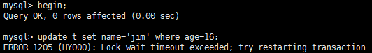 mysql> begin;Query OK, 0 rows affected (0.00 sec)mysql> update t set name='jim' where age=16;