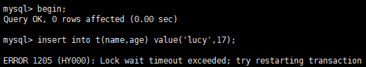 mysql> begin;Query OK, 0 rows affected (0.00 sec)mysql>insert into t(name,age) value('lucy',17);
