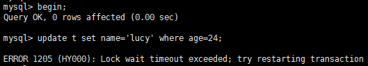 mysql> begin;Query OK, 0 rows affected (0.00 sec)mysql> update t set name='lili' where age=24;Query OK, 0 rows affected (0.00 sec)Rows matched: 1 Changed: 1 Warnings: 0