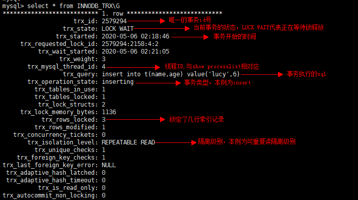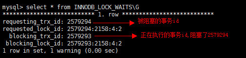 SELECTr.trx_wait_started AS wait_started,TIMEDIFF(NOW(),r.trx_wait_started) AS wait_age,rl.lock_table AS locked_table,rl.lock_index AS locked_index,rl.lock_type AS locked_type,r.trx_id AS waiting_trx_id,r.trx_mysql_thread_id AS waiting_pid,sys.format_statement(r.trx_query) AS waiting_query,rl.lock_id AS waiting_lock_id,rl.lock_mode AS waiting_lock_mode,b.trx_id AS blocking_trx_id,b.trx_mysql_thread_id AS blocking_pid,sys.format_statement(b.trx_query) AS blocking_query,bl.lock_id AS blocking_lock_id,bl.lock_mode AS blocking_lock_modeFROM information_schema.INNODB_LOCK_WAITS wINNER JOIN information_schema.INNODB_TRX bON b.trx_id = w.blocking_trx_idINNER JOIN information_schema.INNODB_TRX r ON r.trx_id = w.requesting_trx_idINNER JOIN information_schema.INNODB_LOCKS bl ON bl.lock_id = w.blocking_lock_idINNER JOIN information_schema.INNODB_LOCKS rl ON rl.lock_id = w.requested_lock_id ORDER BY r.trx_wait_started\G