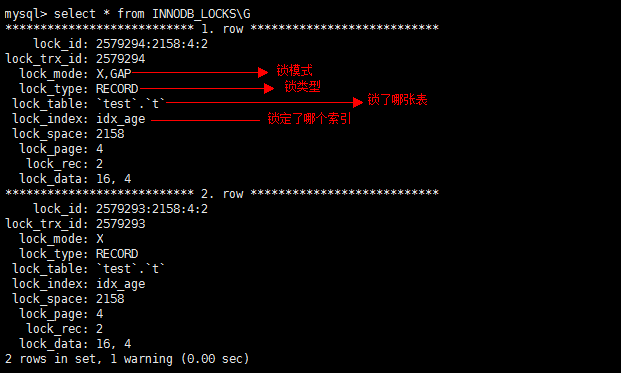 mysql> begin;Query OK, 0 rows affected (0.00 sec)mysql> select * from t where age >=16 and age<24 for update;+----+------+------+| id | name | age |+----+------+------+| 4 | jack | 16 |+----+------+------+1 row in set (0.00 sec)