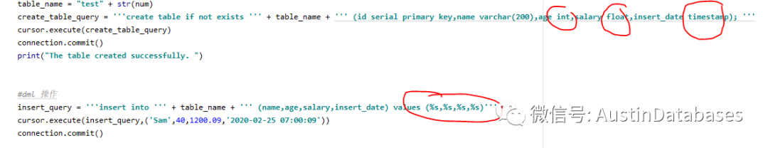 在DML 操作中,大部分情况都是套好“模版” 然后将实际值带入到传参,实际中postgresql 中的字段都是有不同的类型在使用,而在psycopg2中,所有的字段类型占位符均使用 %s ,而不使用 %d (int) , %f (float) 等带入。