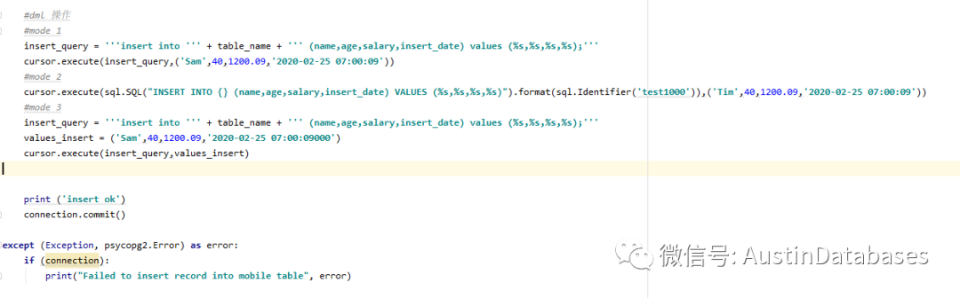 但实际上psycopg2 中的DML 操作并不是只有这一种方式。