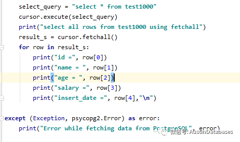 在基于简单的DML操作后,需要对数据表进行简单的查询,下面就是一段最简单的全表select 并输出的语句,需要将
