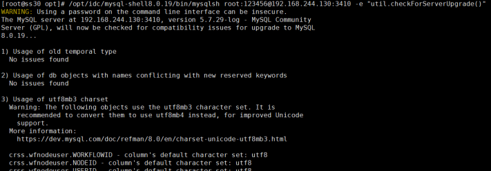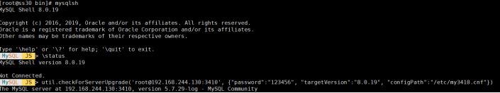 #mysqlsh root:123456@192.168.244.130:3410 -e 'util.checkForServerUpgrade({"targetVersion":"8.0.19","configPath":"/etc/my3410.cnf"})';MySQL JS > util.checkForServerUpgrade('root@192.168.244.130:3410', {"password":"123456", "targetVersion":"8.0.11", "configPath":"/etc/my3410.cnf"})