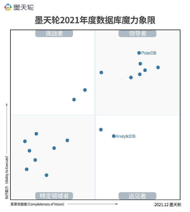 近日,墨天轮举办了“2022年新春发布会暨国产数据库年度颁奖典礼”,首次公开发布了“2021年度中国数据库魔力象限”,阿里云数据库共有两款产品入选魔力象限,云原生关系型数据库PolarDB入选领导者象限,云原生数据仓库AnalyticDB入选远见者象限。同时,会上还颁布了2021年度数据库奖项,PolarDB赢得“2021年度云原生数据库奖”,图数据库GDB荣获“2021年度图数据库奖”(唯一入选)。