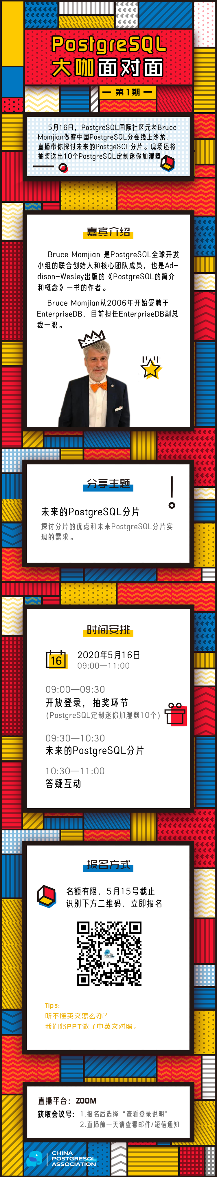 Bruce Momjian 认为分片和透明数据加密是PostgreSQL未来最重要的发展方向。关于分片,北京时间5月16日(周六)上午9点30,Bruce将作客中国PsotgreSQL分会《大咖面对面》,直播带你探讨未来的PostgeSQL分片。