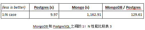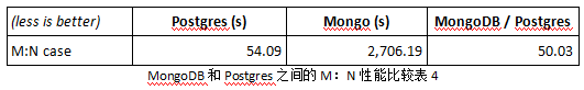 在M:N情况下,事情也很糟糕。同样,MongoDB有一个单一策略,被硬编码到应用程序中。相反,Postgres可以从所有可用选项中进行选择。表4显示了结果性能比较。