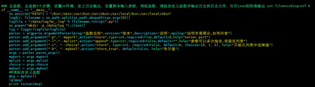 【主函数】:定义脚本的日志目录,脚本的数据参数(此处模拟常用的4类输入参数:字符串、列表、枚举、布尔值)。自定义函数快的return信息永远被打印到日志文件里。最终保留一个json格式的print 输出