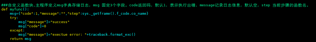 【自定义函数块】:自定义函数快中。自定义函数中用一个字典保存函数执行的状态。有 code message 2个字段 , code标志功能执行成功与否,0表示成功,其他值表示失败。message 记录执行信息。函数的功能永远在try中。失败则返回失败信息到msg["message"]。保证输出永远是msg字典。