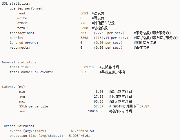 [第n秒] 线程: tps:每秒事务数 qps:每秒操作数 (/r/w/o:read write other即其他操作) lat 响应时间95%在56.84ms以下 每秒错误个数(可能是冲突,死锁等等) 每秒重连个数.