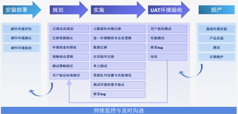 如下图所示,从Oracle迁移到Greenplum一般要经过规划->安装部署->实施->UAT验证->投产五个阶段, 中间涉及数据库厂商、应用开发商、用户等多个部门和组织的配合,为了保证迁移项目的成功,每一个环节都要仔细分析并充分验证。迁移效果的几个关键因素的影响。