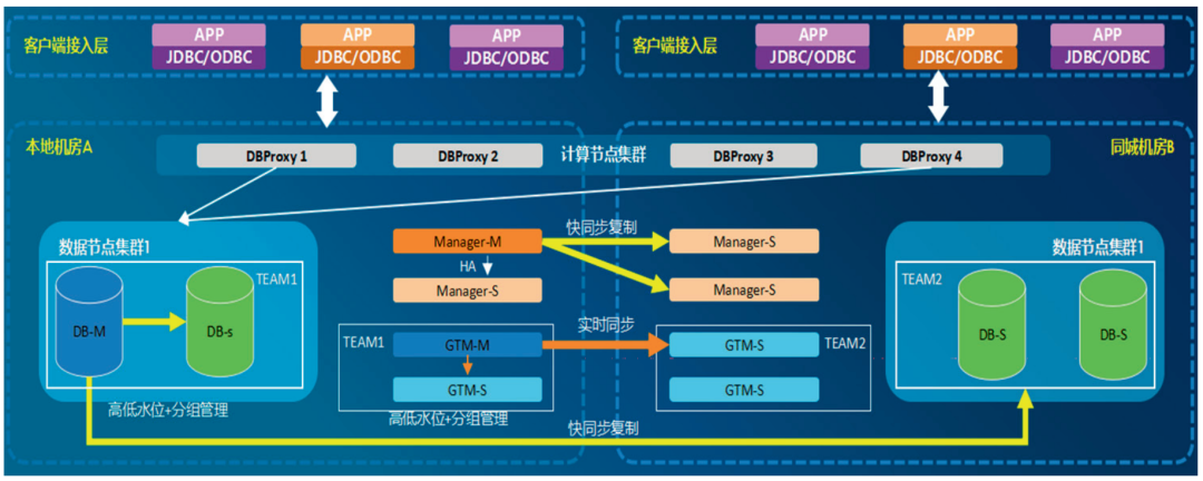 见图所示,为GoldenDB典型架构,所有节点部署在生产A机房和同城B机房。整个集群包括前置计算节点DBProxy、集群管理节点Manager、数据库节点DB和全局事务管理器GTM。计算节点无状态,可以任意增加;集群管理节点生产机房为HA部署,同城之间采用快同步复制;数据库节点之间采用快同步复制;全局事务管理器节点之间采用实时增量与定时全量方式同步。