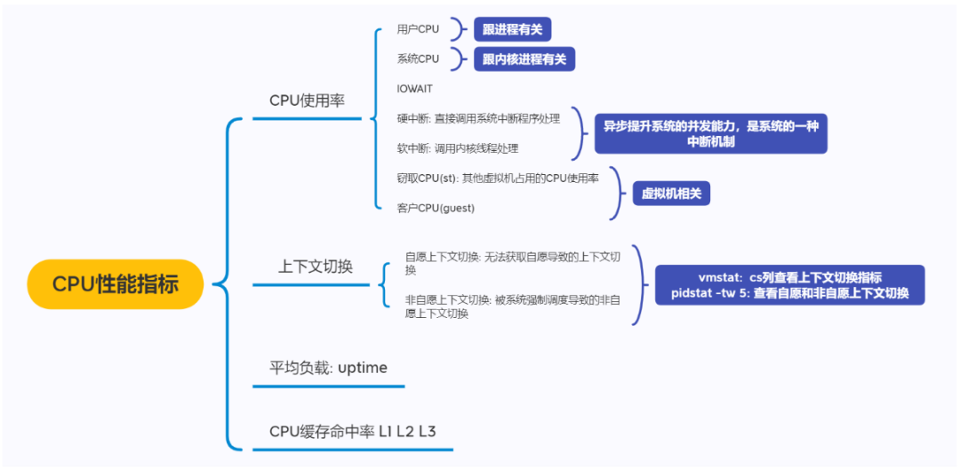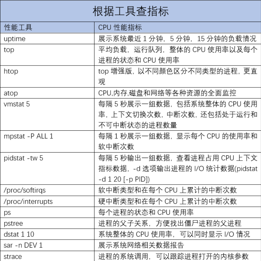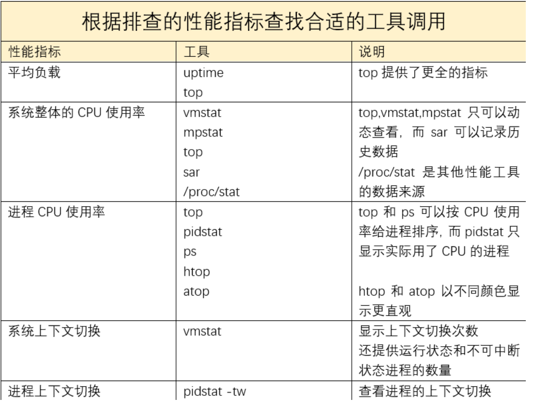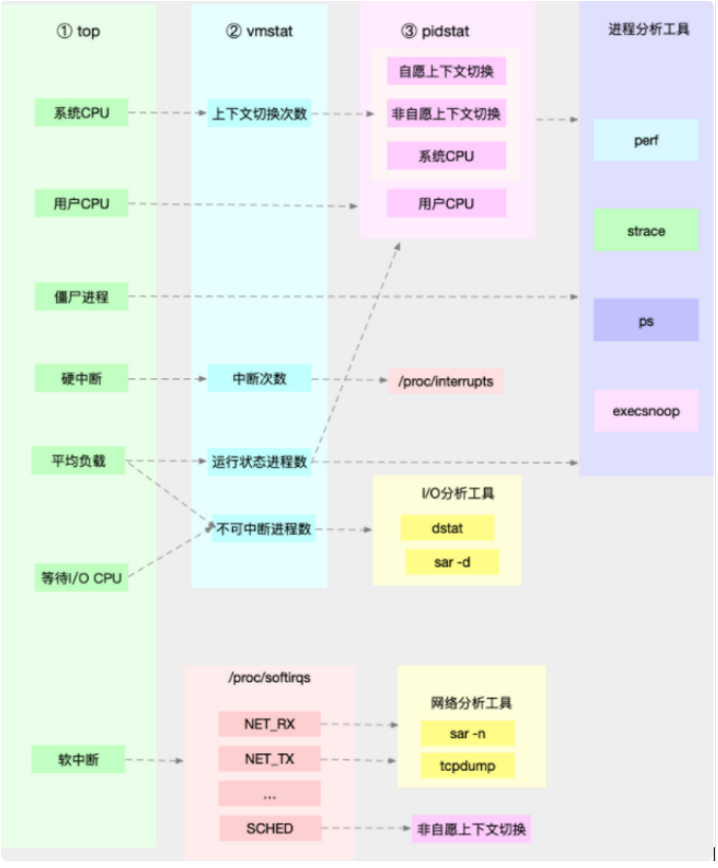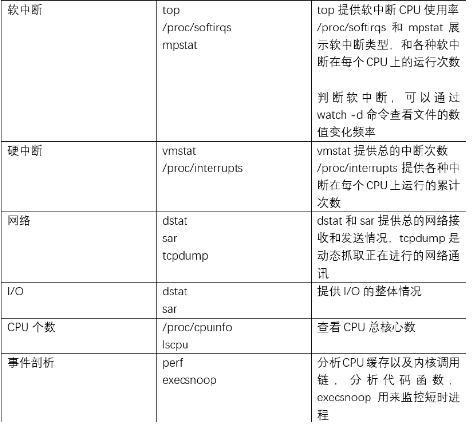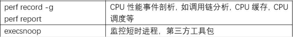toppidstat 1 # 间隔1秒输出一组数据pidstat -d 1 20 # 每隔1秒输出20组数据 包括所有进程数据pidstat -d -p 进程ID 1 3 # 间隔1秒输出三组数据 -d代表输出进程的I/O统计数据perf top -g -p 进程ID # 根据进程ID找出调用的函数perf top -g # 分析消耗CPU时钟的事件pstree # 查看进程树,方便找出父进程perf record -g # 保存CPU事件perf report # 分析刚保存的事件情况topmpstat -P ALL 1 # 查看CPU性能指标数据vmstat 5 # 分析内存和CPU上下文切换指标工具pidstat -tw 5 # 查看进程占用CPU上下文指标数据execsnoop # 分析短时进程的工具