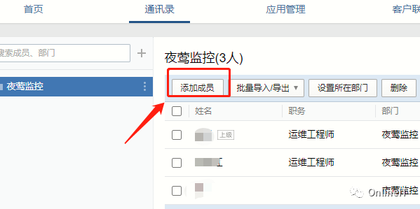 2、在通讯录模块下,根据需要添加企业成员,如图:
