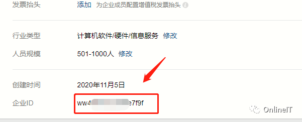 上图中的corp_id的内容表示企业ID,在企业微信界面,点击最右侧的我的企业,然后就可以看到企业ID,如图: