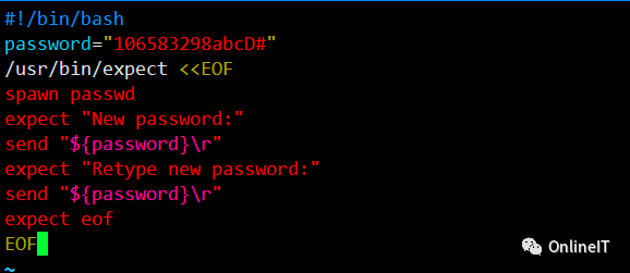 例子1:下面的脚本实现的功能是自动修改root密码,本脚本以bash脚本为基础,添加expect命令,如图: