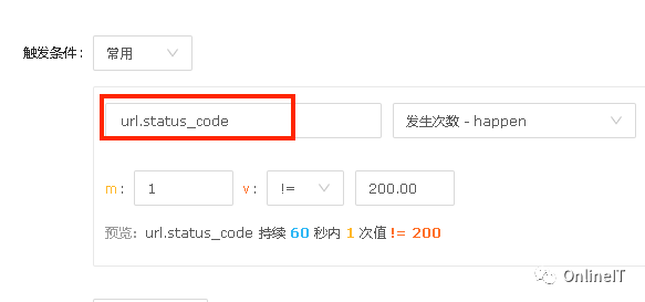然后根据需要配置告警触发条件,本例子为探测1次的返回状态码不等于200则告警,如图:
