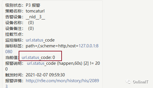 从上图可以看出,当前tomcat已经down,返回状态码为0,所以告警